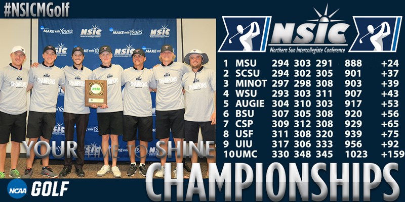 2017 NSIC Men's Golf Championship 2017 NSIC Men's Golf Championships April 13-15 at Paradise Point Golf Complex in Smithville, Mo. Final Results | Player's Scorecard (Final) RD 1 Photos | RD 2 Photos | RD 3 Photos RD 1 Recap | RD 2 Recap | RD 3 Recap #NSICMGolf Tweets SMITHVILLE, Mo. - (Paradise Pointe – Par 72 – 6710 yards) – Minnesota State won its third straight NSIC Men's Golf Championship as the Mavericks erased a two stroke deficit after round two and moved up three spots on the leaderboard to win by 13 strokes. The championship was played at Paradise Pointe Golf Complex in Smithville, Missouri, over the past three days. The Mavericks, which have now won seven of the last nine NSIC Men's Golf Championships, shot a final round 291 to finish at 888, 13 strokes ahead of second place St. Cloud State (901). MSU had three golfers finish in the top-10, led by Ethan Kraus, who finished second at 1-over-par (70-72-75=217) Augustana’s Parker Klitzke earned NSIC Medalist honors as he finished at 2-under-par for the championship. Klitzke, who shot a four-over-par 76 during a blustery round three, tied the NSIC Championship low round score with his 4-under-par round of 68 in round two. Klitzke (70-68-76=214) becomes the first Viking to earn NSIC Men’s Golf Medalist honors, as he led Augustana to a fifth place team finish. Joining Klitzke and Kraus on the NSIC All-Tournament team were St. Cloud State’s David Scharenbroich (69-75-74=218 +2), Minot State’s Matthew Kreutz (72-73-75=220 +4) and MSU’s Kelton Schmitz (74-76-71=221 +5). 2017 NSIC Men's Golf All-Tournament Team With the win, Minnesota State earned the NSIC’s automatic bid to the NCAA Midwest/Central Region Tournament played May 8-10 at Awarii Dunes in Axtell, Nebraska. The entire field for the NCAA Men's Golf Championships will be announced Friday, April 28 at 5 p.m. on NCAA.com. Ten teams (including automatic qualifiers) and the top four individuals not with a team will be selected from each region to compete in the Midwest/Central Region Tournament played May 8-10 at Awarii Dunes in Axtell, Nebraska. The NCAA Championships will be held May 22-26 at Reunion Resort/Watcon Course in Kissimmee, Florida. Rank Team Scores Total Par 1 Minnesota State 294 303 291 888 +24 2 Winona State 293 303 302 898 +34 3 St. Cloud State 294 302 305 901 +37 4 Minot State 297 298 308 903 +39 5 Bemidji State 307 305 299 911 +47 6 Augustana 304 310 303 917 +53 7 Concordia-St. Paul 309 312 308 929 +65 8 Sioux Falls 311 308 320 939 +75 9 Upper Iowa 317 306 333 956 +92 10 Minnesota Crookston 330 348 345 1023 +159 Rank Player Team Scores Total Par 1 Klitzke, Parker Augustana 70 68 76 214 -2 2 Kraus, Ethan Minnesota State 70 72 75 217 +1 3 Scharenbroich, David St. Cloud State 69 75 74 218 +2 4 Kreutz, Matthew Minot State 72 73 75 220 +4 5 Schmitz, Kelton Minnesota State 74 76 71 221 +5 6 Cook, Cody Bemidji State 73 77 72 222 +6 7 Rasinski, Noah Concordia-St. Paul 74 77 72 223 +7 t 8 Tyler Beeck Winona State 75 77 72 224 +8 t 8 Bentley Glass Winona State 71 72 81 224 +8 t 8 O'Keefe, Karson Minot State 71 75 78 224 +8 t 8 Svac, J.J. Minnesota State 74 78 72 224 +8 t 12 Cooney, Jonathon Sioux Falls 75 77 73 225 +9 t 12 Duncanson, Riley St. Cloud State 69 77 79 225 +9 t 12 Jonathan Lindquist Winona State 73 79 73 225 +9 15 Leintz, Aaron Bemidji State 73 76 78 227 +11 t 16 Maiers, Chance Concordia-St. Paul 78 77 73 228 +12 t 16 Ryynanen, Troy St. Cloud State 76 75 77 228 +12 t 18 Benjamin Jasper Winona State 74 77 78 229 +13 t 18 Reynolds, Cody Minot State 76 76 77 229 +13 t 20 Dillon, Derek Sioux Falls 78 74 78 230 +14 t 20 Martinez, Gonzalo Minnesota State 80 77 73 230 +14 t 22 Anderson, Trent Concordia-St. Paul 76 76 79 231 +15 t 22 Schweinefus, Logan Upper Iowa 78 74 79 231 +15 t 22 Austin van Sytzama Winona State 75 77 79 231 +15 t 22 Vatnsdal, Joe Bemidji State 83 75 73 231 +15 26 Thompson, Bryce Minnesota State 76 78 79 233 +17 27 Urch, Ted Augustana 81 79 75 235 +19 t 28 Bean, Matthew Minot State 84 74 78 236 +20 t 28 Crawford, Cole Augustana 76 84 76 236 +20 t 30 Harcourt, Carson Minot State 78 80 79 237 +21 t 30 Kranz, Carter Augustana 77 79 81 237 +21 t 30 Otto, Samuel Bemidji State 79 77 81 237 +21 33 Skaar, Ben Bemidji State 82 80 76 238 +22 t 34 Hanson, Wyatt St. Cloud State 84 80 75 239 +23 t 34 Tranbarger, Jalen Upper Iowa 80 76 83 239 +23 t 36 Cooksley, Curtis Upper Iowa 79 75 89 243 +27 t 36 Haag, Kyle St. Cloud State 80 75 88 243 +27 t 36 Loosbrock, Ben Sioux Falls 77 78 88 243 +27 t 39 Korn, Brett Sioux Falls 81 79 86 246 +30 t 39 Lensing, Joseph Upper Iowa 80 81 85 246 +30 41 Peterson, Brian Concordia-St. Paul 81 82 84 247 +31 42 T'mone Kleindl Minnesota Crookston 82 84 82 248 +32 43 Williams, Les Augustana 84 89 76 249 +33 44 Berry, Blake Sioux Falls 83 85 83 251 +35 45 Ricky Phillips Minnesota Crookston 80 85 87 252 +36 46 Dunn, Tyler Concordia-St. Paul 81 85 88 254 +38 47 Schulte, Hunter Upper Iowa 84 86 86 256 +40 48 Eric Gullicks Minnesota Crookston 81 94 87 262 +46 49 Brandon Brown Minnesota Crookston 87 88 89 264 +48 50 Ben Koisti Minnesota Crookston 90 91 89 270 +54 2015-16 Men's Golf Championship Website 2014-15 Men's Golf Championship Website 2013-14 Men's Golf Championship Website #NSICMGolf